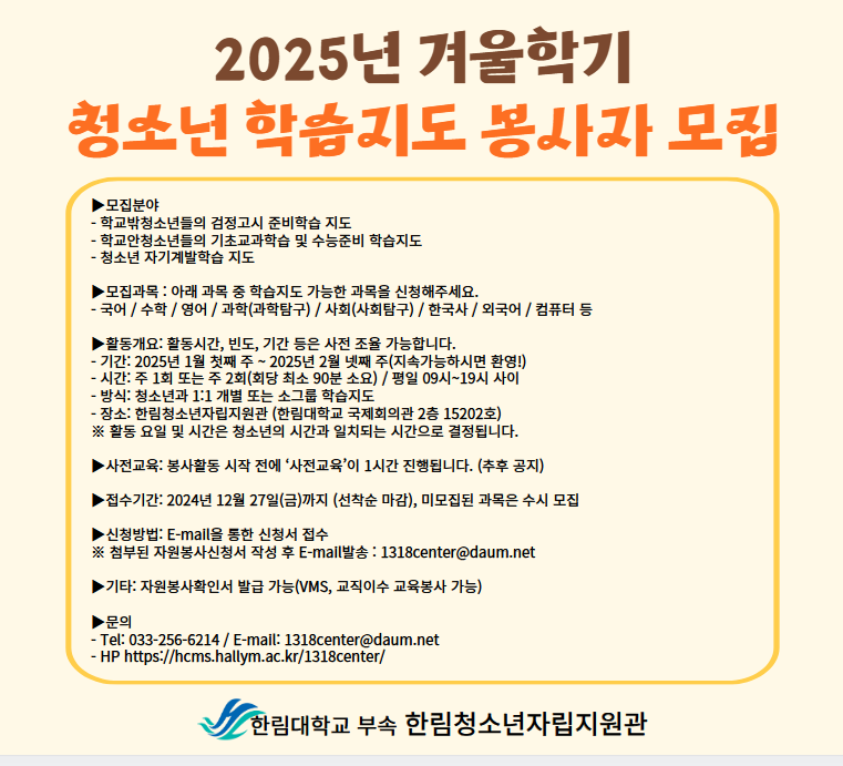 2025년 겨울학기 동안 청소년들의 학습을 도와줄 멘토봉사자를 모집합니다.