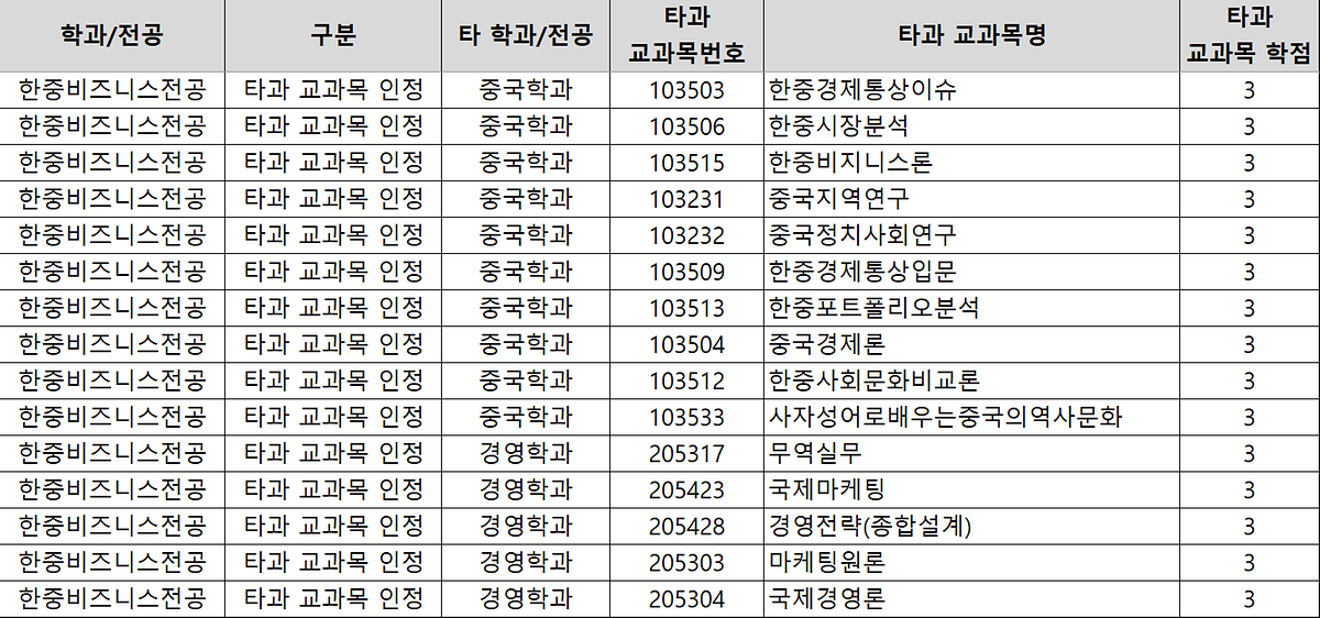 한중비즈니스: 타과 교과목 인정 15과목 (중국학과 10과목 / 경영학과 5과목)