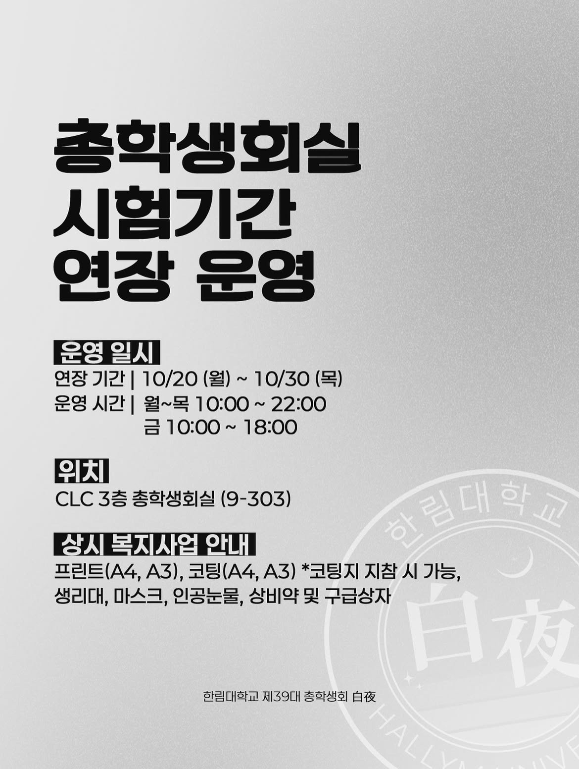 2025년도 2학기 중간고사 총학생회실 시험기간 연장 운영 안내