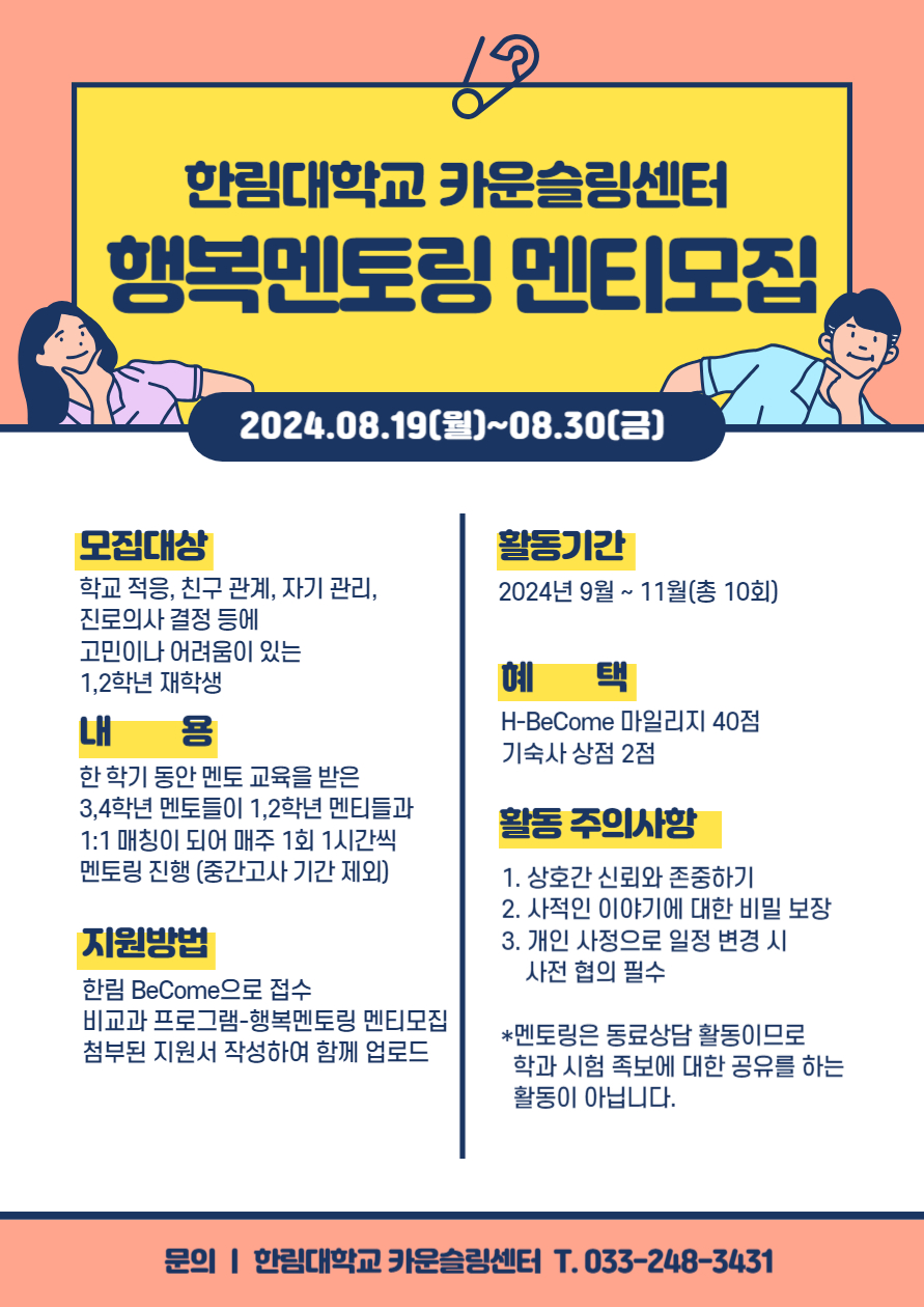 1. 지원자격 : 3, 4학년 멘토 선배와 대학생활 적응, 친구관계, 자기관리, 학습방법, 진로결정 등에 대한 나눔을 통해 더욱 폭넓고 활기찬 대학생활을 만들어가길 원하는 **1, 2학년 재학생**