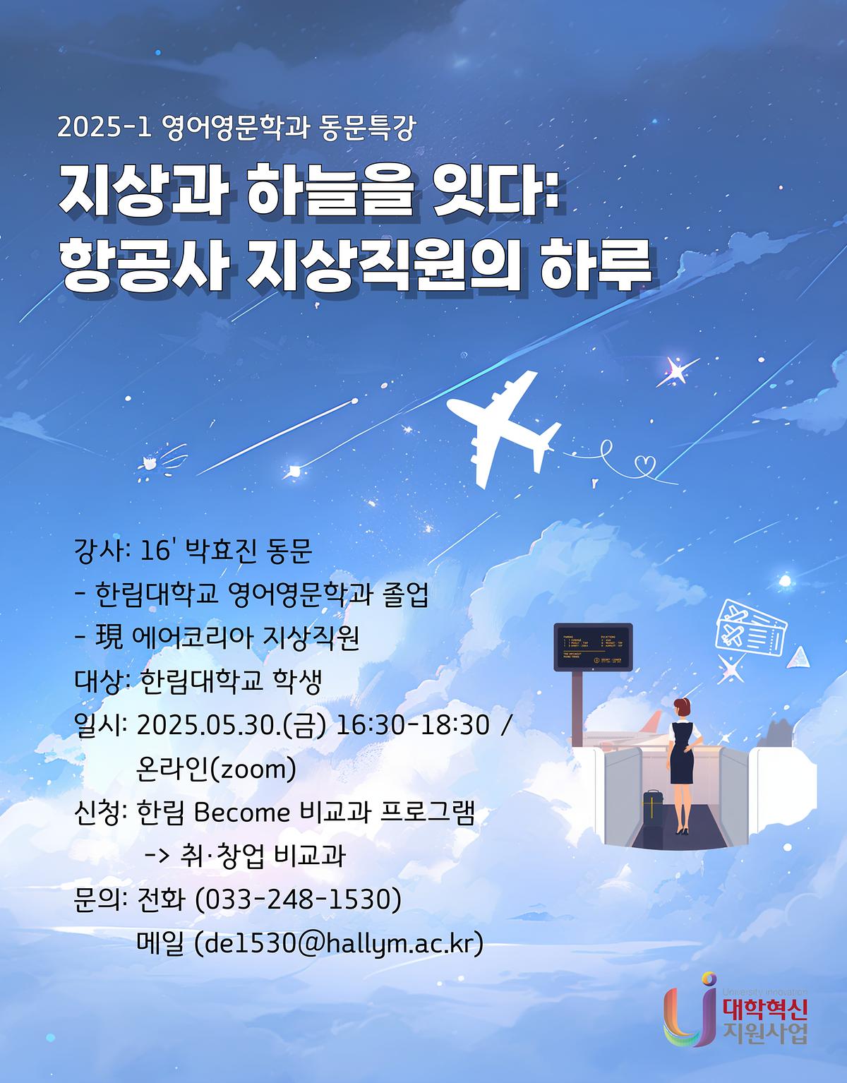 ▶ 신청: 한림 BeCome 홈페이지 [한림 BeCome 로그인] - [비교과프로그램] - [비교과프로그램 신청] - [. 창업 비교과] – [2025-1 영어영문학과 동문특강]