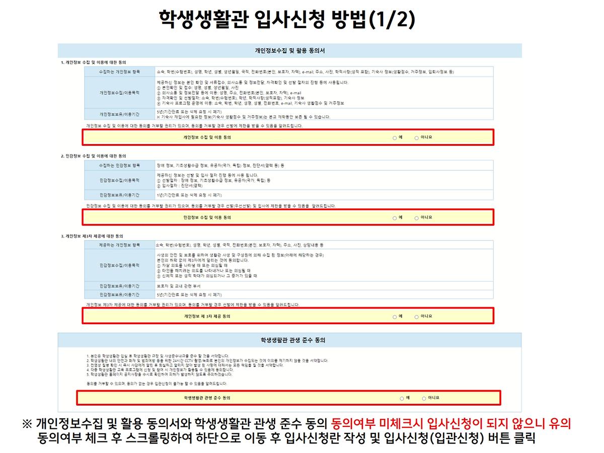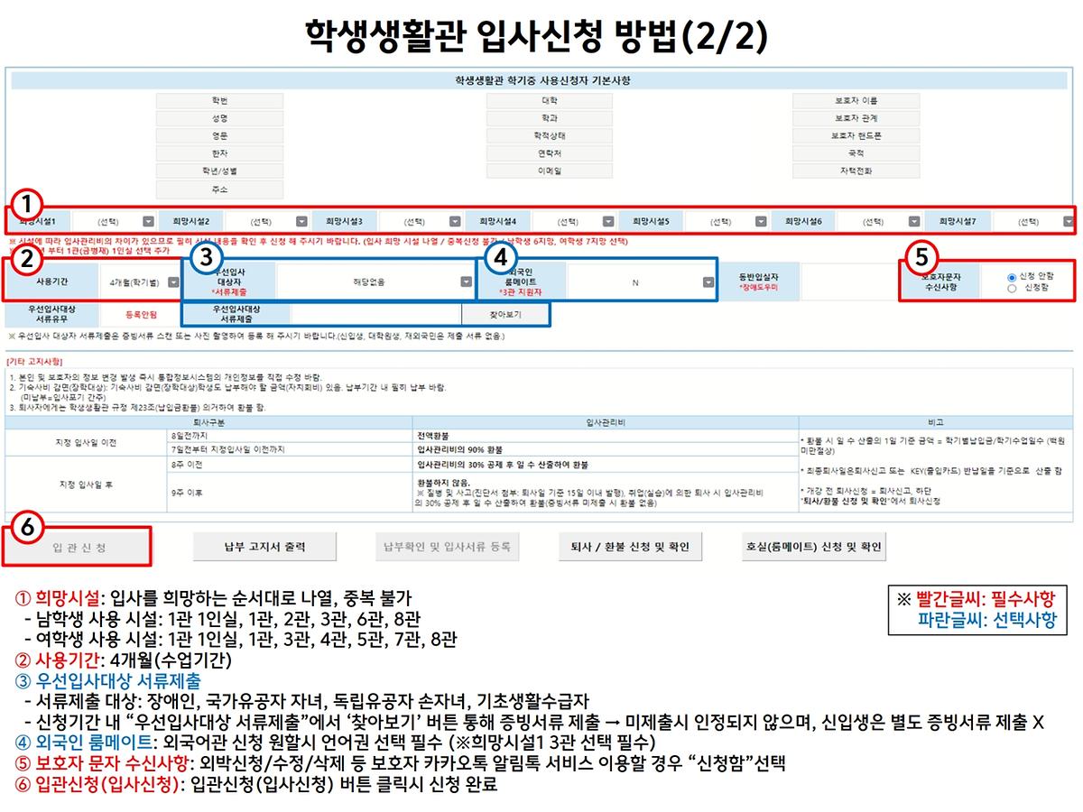 2. 신청방법: 학생정보시스템(학사행정→학생생활관→사생정보 →학기중 “입사신청”)