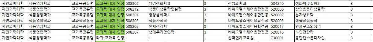 - 타과 교과목 인정 : 타 학과/전공의 해당 교과목을 이수할때, 대응하는 식품영양학과의 해당 교과목을 이수한 것으로 인정