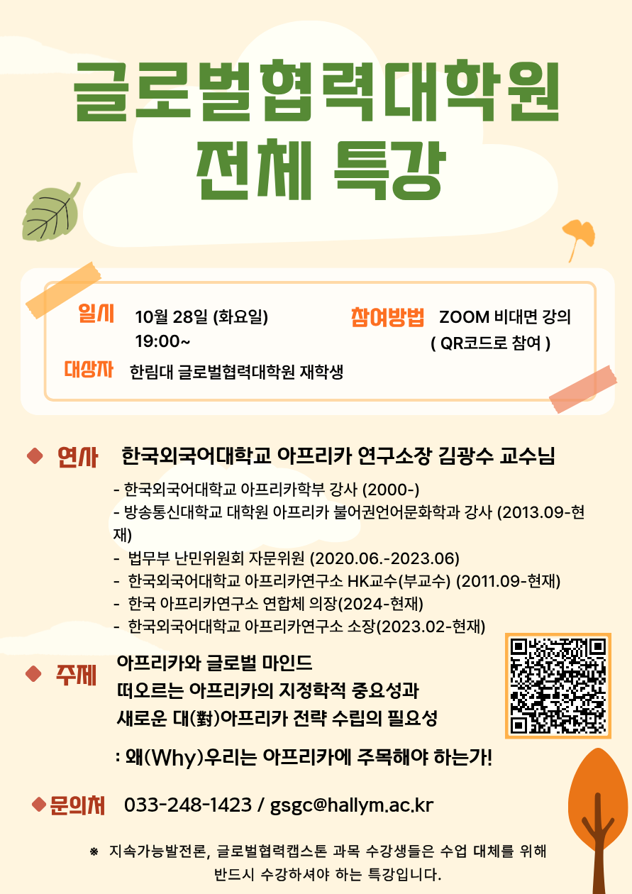 글로벌협력대학원 재학생분들을 대상으로 아래와 같이 특강을 진행하오니