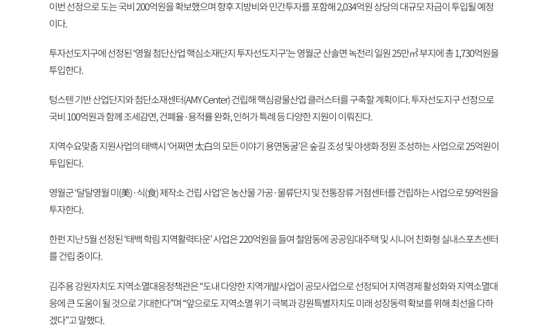 [강원특별자치도] 태백·영월 지역개발사업에 2천억 투입