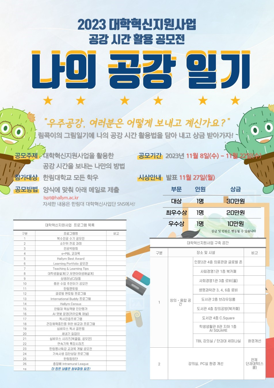 한림대학교 대학혁신사업단에서는 대학혁신지원사업과 함께하는 공강 시간 활용법을 공유해보는 「나의 공강 일기」공모전을 개최합니다.