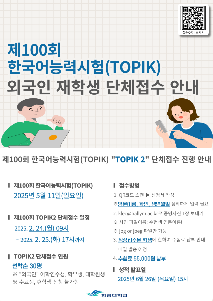 제100회 한국어능력시험(TOPIK) 외국인 재학생 TOPIK2 단체접수 안내