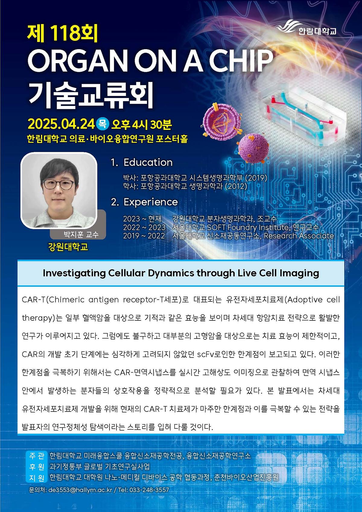 이번 기술교류회에서는 강원대 박지훈 교수를 연사로 모시고 '실시간 세포 이미징을 통한 세포 동역학 연구' 를 주제로 강연이 진행되었다.