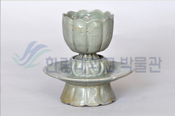 열 잎의 꽃봉오리 모양의 청자 찻잔과 꽃 모양의 잔 받침으로, 성형과 조각기술을 보여주는 상형청자입니다.