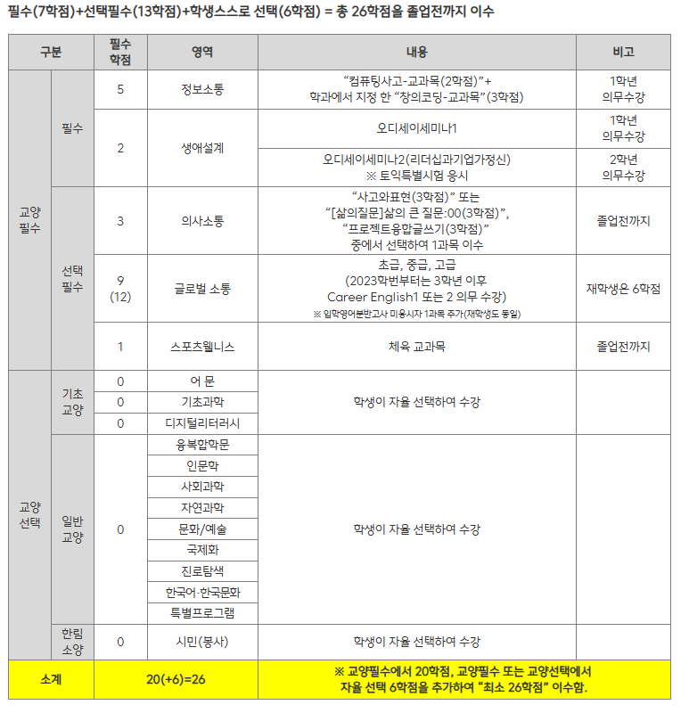 ※ 의과대학 및 글로벌융합대학은 교양필수·교양선택 이수기준은 따로 정함.(단과대학 교학팀 문의)