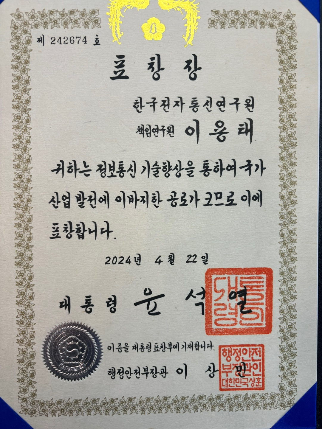 2024.04.22(월) 융합과학수사학과 객원교수 이용태 교수는 정보통신 기술 향상 분야에서 대통령 표창을 수상하였다.