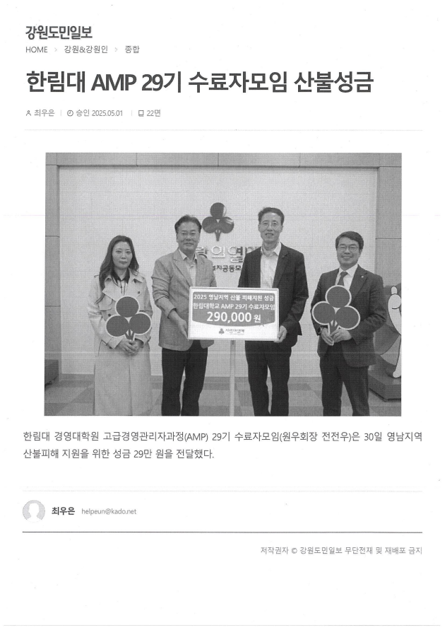 한림대 경영대학원 고급경영관리자과정(AMP) 29기 수료자모임(원우회장 전전우)은 30일 영남지역 산불피해 지원을 위한 성금 29만 원을 전달했다.