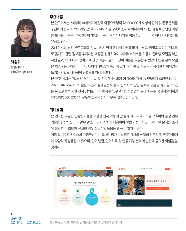 하 교수님은 “발달 과정에 있는 아동의 음성을 기존 기술로는 정상과 지연을 명확히 구분하기 어려운 점이 많았다”며 “이번 연구를 통해 AI 자동 음성인식 기술을 이용해 아동의 말소리를 더욱 객관적으로 평가할 수 있는 기반을 마련하였다”고 소감 밝혔습니다. 한편, 하 교수님은 올해 Speech4All이라는 AI 음성인식 및 말-언어 분석 전문 회사를 창업해 연구성과의 실용화에 도전하고 있습니다.