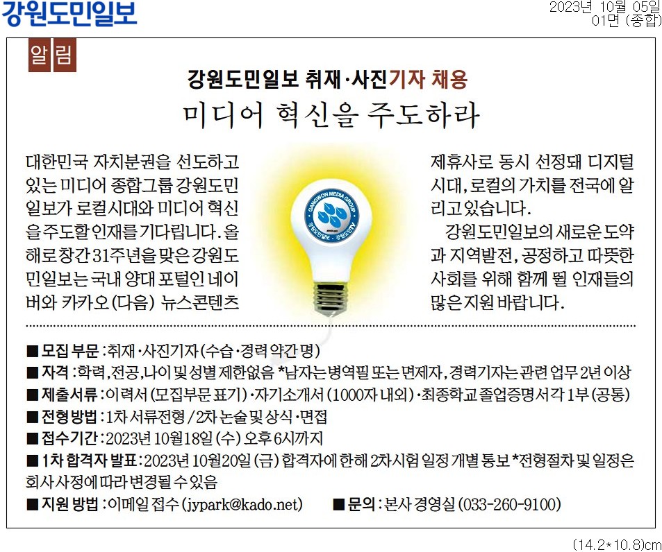 강원도민일보의 새로운 도약과 지역발전, 공정하고 따뜻한 사회를 위해 함께 뛸 인재들의 많은 지원 바랍니다.