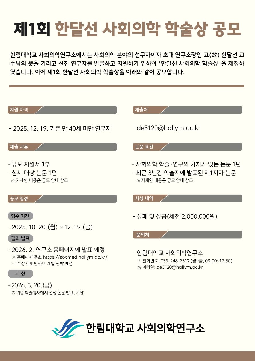 한림대학교 사회의학연구소에서는 사회의학 분야의 선구자이자 초대 연구소장인 고(故) 한달선 교수님의 뜻을 기리고 신진 연구자를 발굴하고 지원하기 위하여 「한달선 사회의학 학술상」을 제정하였습니다.