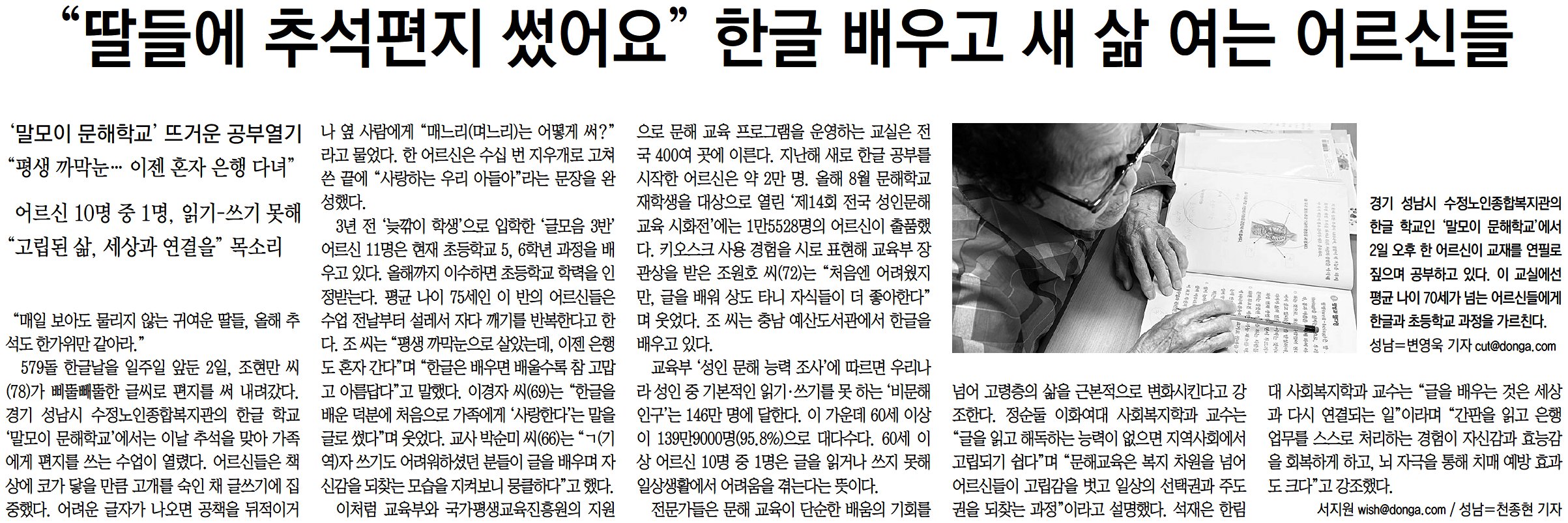 “딸들에 추석편지 썼어요” 한글 배우고 새 삶 여는 어르신들