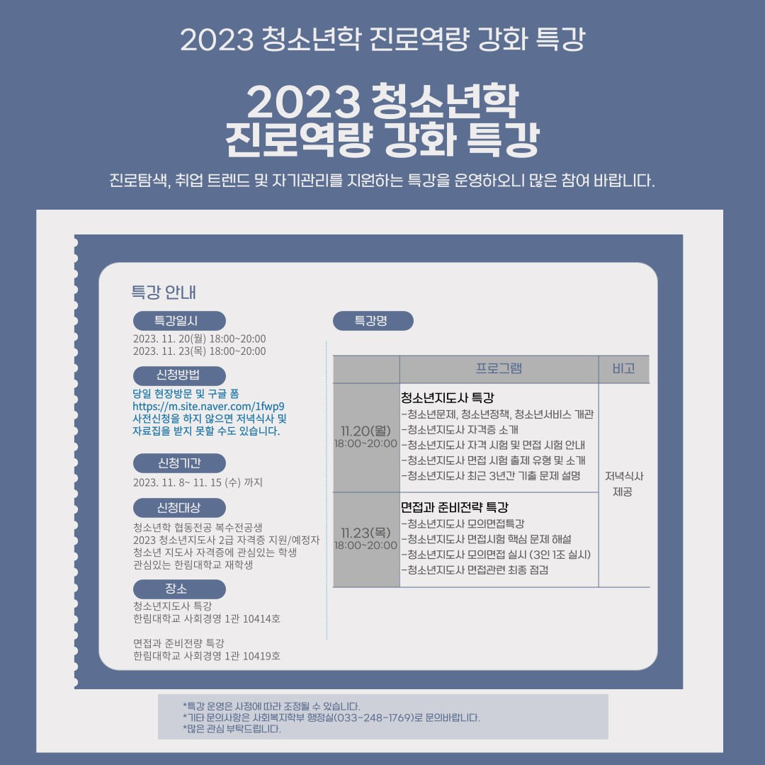 2023년 한림대학교 청소년학에서는 진로취업프로그램의 일환으로 진로역량 강화 특강을 시행하오니 학생들의 많은 참여 부탁드립니다.