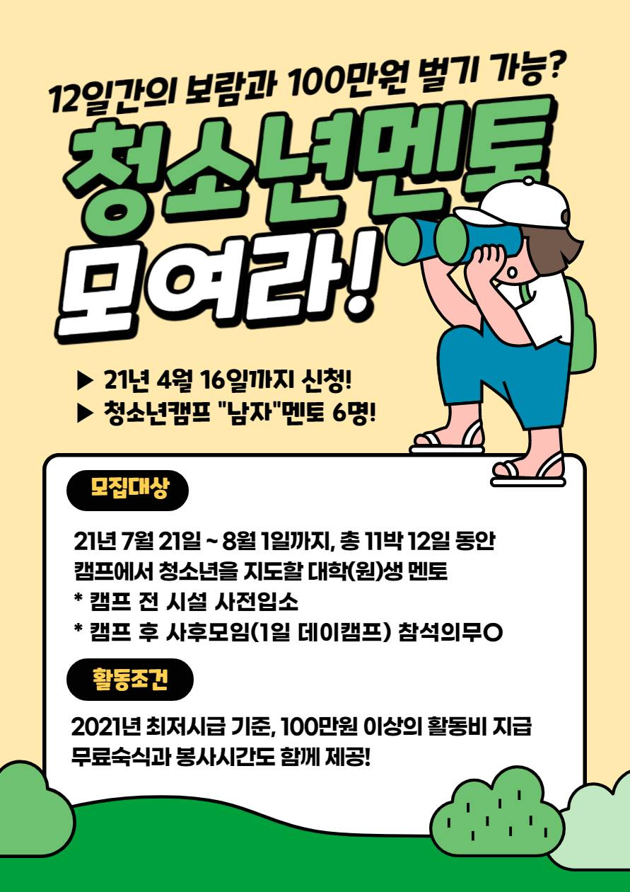 중학생청소년들과의 기대되는 12박 13일 동안 멋진 멘토가 되어주실 분! 지금 바로 지원하세요~!