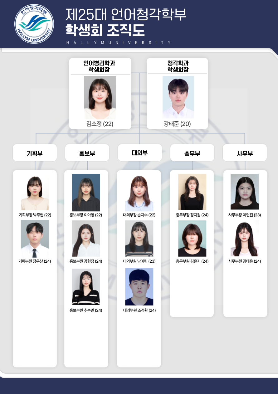 우리 학생회는 언어병리학전공 및 청각학전공의 회장단과 기획부, 대외부, 홍보부, 총무부, 사무부로 구성되어 있습니다.